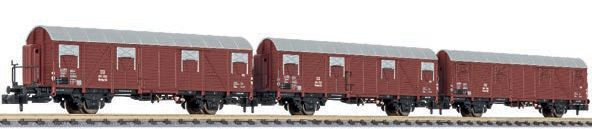 Set aus 3 gedeckten Güterwagen, Bauart Glmhs 50 der DB, Ausführung mit Bretterwänden und Bremserhaus, Betriebszustand 1956. Unterschiedliche Ausführungs-Details. Betriebsnummern: 201 252, 201 335 und 201 501, LüP je Wagen 81 mm.