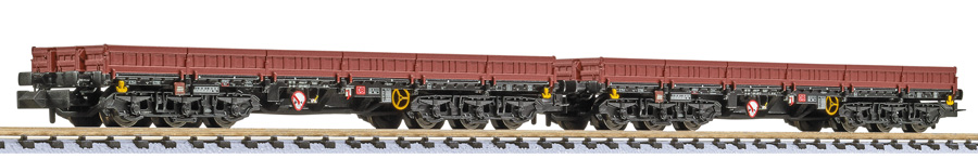 2-teiliges Set 6-achsige Schwerlastwagen, Bauart Samms-u 454 der DB AG, Betriebszustand 1998, Bordwände braun, Fahrgestell und Drehgestelle schwarz, Betriebs-Nrn. 486 0 054-4 und 486 1 011-3, für die Epoche 5.