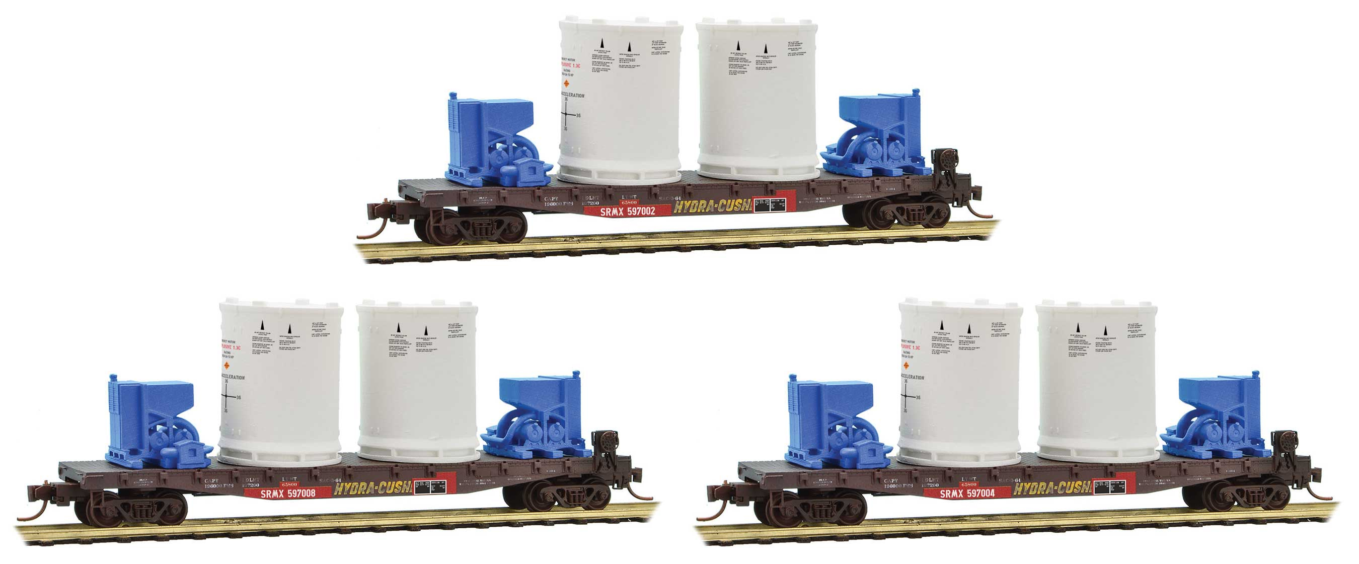 In 1964 Southern Pacific developed the 100-ton F-100 flat cars primarily to use their Hydra-Cushion technology to move large or sensitive components. Five cars of the class were assigned to transport Titan Rocket Boosters and it?s supporting equipment from Vandenberg AFB, California to Cape Canaveral, Florida for assembly. These cars remained in SP service until 1994 when United Technologies took over the program until the last Titan launch in 2008. This weathered 3-pack will include resin-cast booster canisters, 3D printed AC Units and decals to decorate the loads.