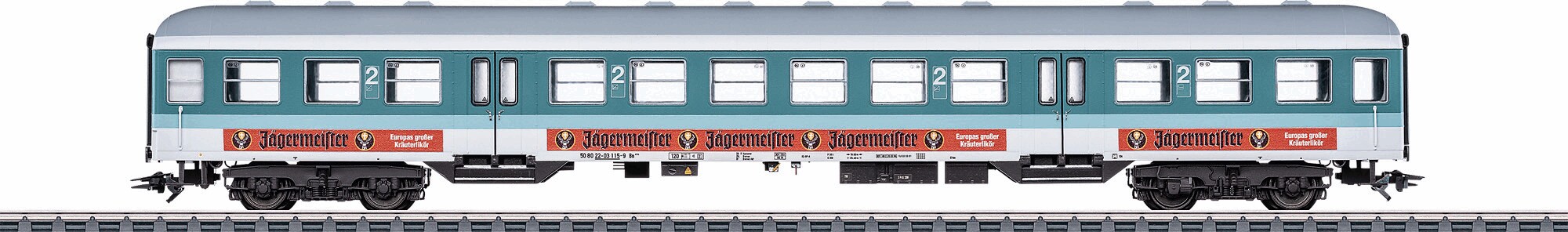 Vorbild: Nahverkehrswagen Bauart Bn 434, 2. Klasse der Deutschen Bahn AG. Minttürkise/Lichtgraue Grundfarbgebung mit seitlicher Jägermeister-Werbegestaltung. Ausführung mit Runddach. Betriebszustand ab 1996.
