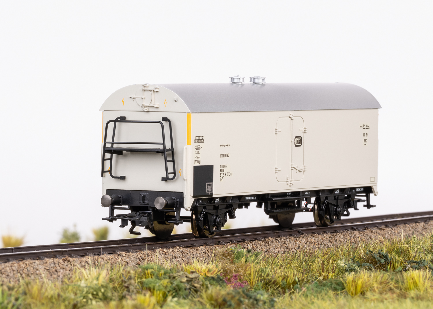 Kühlwagen Ibs 377 - Vorbild: 2-achsiger Kühlwagen Bauart Ibs 377 (ex Tehs 50) der Deutschen Bundesbahn (DB). Mit stirnseitigen Aufstiegsbühnen. Kieselgraue Grundfarbgebung. Betriebszustand um 1983.Modell: Separat eingesetzte Dachlüfter und angesetzte Aufstiegsbühnen an den Stirnseiten. Länge über Puffer 13,4 cm.Gleichstromradsatz E32376004. Trix-Express-Radsatz E36660700.