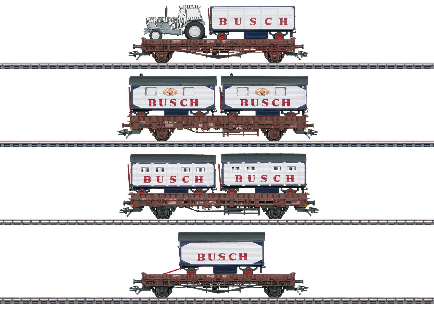 Güterwagen-Set Zirkus Busch - Modell: Zwei Niederbordwagen Bauart Kkklms 3440 und je ein Niederbordwagen Bauart Kls 3360 bzw. 3361. Alle Wagen mit separat angesetztem Sprengwerk und attraktiver Beladung. Ein Wagen mit einem Traktor ZT 304 und einem geöffnetem Packwagen, ein Wagen mit zwei unterschiedlich beschrifteten Wohnwagen, ein Wagen mit zwei unterschiedlich beschrifteten Raubtierwagen und ein Wagen mit einem geschlossenen Packwagen beladen. Haltekeile und Zirkus Busch-Logos für die Wohnwagen liegen bei. Modell des Traktors von der Firma Busch und die Zirkuswagen von der Firma Preiser. Gesamtlänge über Puffer ca. 59,5 cm. Gleichstromradsatz E700580. Vorbild: Vier Güterwagen unterschiedlicher Bauarten der Deutschen Reichsbahn (DR/DDR). Alle Wagen mit unterschiedlichen Zirkusfahrzeugen des Zirkus Busch, dem Staatszirkus der DDR beladen. Betriebszustand Ende der 1980er-Jahre. Einen ergänzenden Niederbordwagen mit Fahrzeugen des Zirkus Busch finden Sie unter der Artikelnummer 45041.Die passende Zuglokomotive der Baureihe 254 finden Sie unter der Artikelnummer 39991. Attraktive Beladung mit verschiedenen Zirkusfahrzeugen