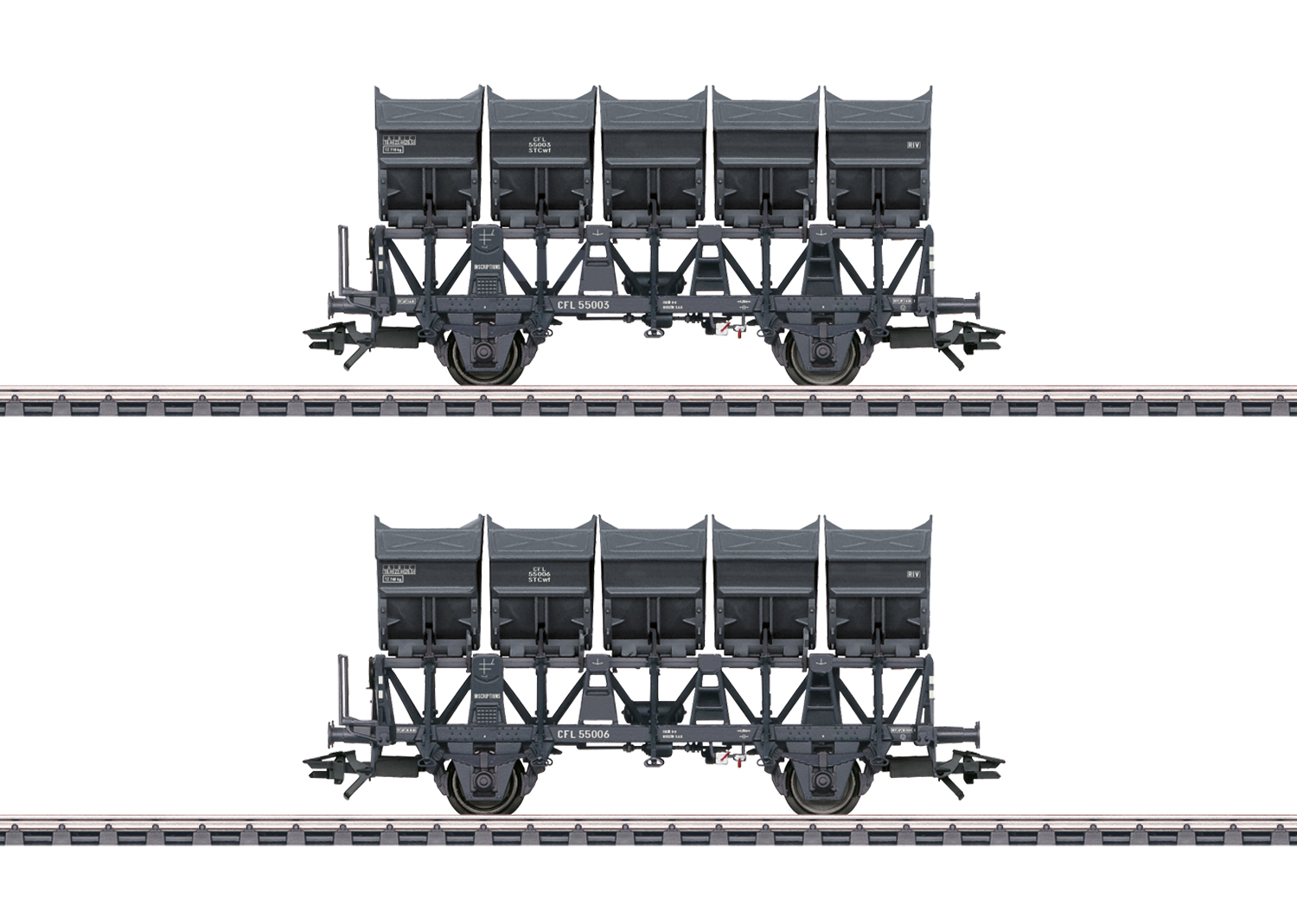 Muldenkippwagen-Set CFL - Vorbild: 2 zweiachsige Muldenkippwagen Bauart STCwf der Luxemburgischen Staatsbahnen (CFL). Graphitgraue Grundfarbgebung. Mit Bremserstand und Handbremse. Betriebszustand Ende der 1950er Jahre.Modell: Detaillierter Ausführung mit durchbrochenen Rahmen, separat aufgesetzte Kippmulden. Beide Muldenkippwagen mit unterschiedlichen Betriebsnummern. Beide Wagen einzeln verpackt, mit zusätzlicher Umverpackung. Gesamtlänge über Puffer 21 cm. Gleichstromradsatz E700580.Die passende Diesel-Rangierlokomotive Köf II finden Sie unter der Artikelnummer 36817 ebenfalls im Märklin H0-Sortiment.