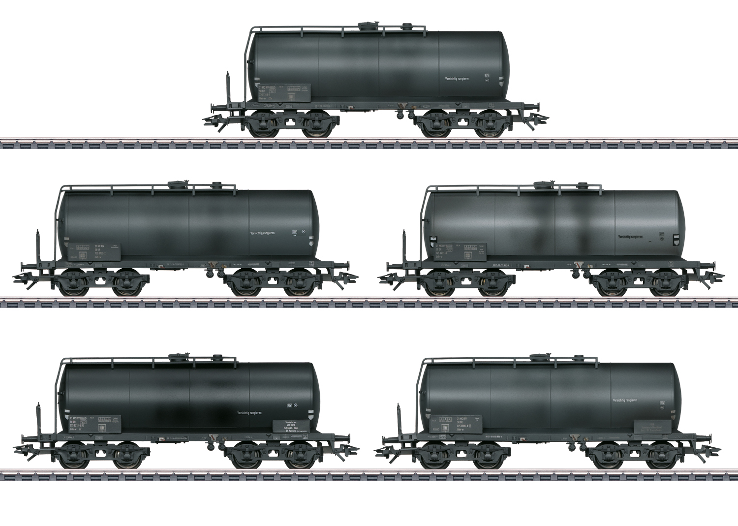 Modell: Laufruhige Spezialdrehgestelle. Angesetzte Aufstiegsleitern und Laufstege. Alle Wagen mit verschiedenen Betriebsnummern, einzeln verpackt und gekennzeichnet. Alle Wagen mit unterschiedlichen Alterungsflächen. Länge über Puffer je Wagen ca. 14,2 cm. Gesamtlänge über Puffer ca. 71 cm.Gleichstromradsatz je Wagen E32376004.Trix-Express-Radsatz je Wagen E33339010. Vorbild: Fünf vierachsige Einheitsleichtkesselwagen für Mineralöle Bauart Uerdingen der Deutschen Reichsbahn (DR). Ältere Bauart mit Pressblech-Drehgestellen und Bremserbühne. Betriebszustand ab 1972. Eine passende Diesellokomotive finden Sie im Märklin H0-Sortiment unter der Artikelnummer 39200.Ein passendes Wagenset finden Sie im Trix H0-Sortiment unter der Artikelnummer 24145.
