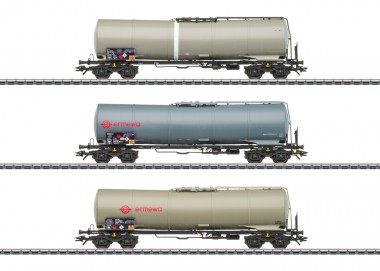 Vorbild: Drei vierachsige Kesselwagen der Bauart Zans. Ausführung mit unisolierten Knickkesseln und stirnseitigen Aufstiegen. Privatwagen der ermewa SAS, registriert in Schweden. Betriebszustand ab 2015.Modell: Detaillierte Fahrgestelle mit durchbrochenem Rahmen und vielen angesetzten Einzelheiten. Alle Wagen einzeln verpackt in zusätzlicher Umverpackung. Gesamtlänge über Puffer ca. 54,5 cm.Gleichstromradsatz E700580.