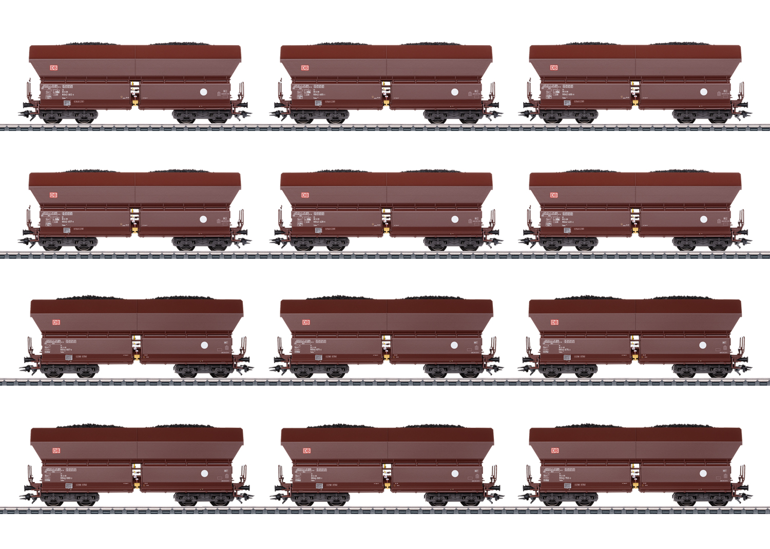 Selbstentladewagen-Set Falns 182 - Vorbild: 12 vierachsige, großräumige, offene Selbstentladewagen Bauart Falns 182 der Deutschen Bahn AG (DB AG). Eingesetzt zum Transport von nässeunempfindlichen Schüttgütern. Rotbraune Grundfarbgebung. Alle Wagen mit 2 Übergangsbühnen. 6 Wagen mit Handbremse an einer Übergangsbühne und 6 Wagen ohne Handbremse. Drehgestelle der Bauart 665. Betriebszustand um 2015.Modell: Selbstentladewagen in maßstäblicher und detaillierter Ausführung, mit vielen angesetzten Einzelheiten. 12 unterschiedliche Betriebsnummern. Alle Wagen mit jeweils 2 angesetzten Übergangsbühnen und 6 Wagen mit Stellrad für Handbremse am Wagenende 2. Vorbildgerecht beide Wagen-Längsseiten jeweils ohne Aufstiegslöcher am Oberkasten und ohne Aufstiegsgriffe. Selbstentladewagen mit Ladegut-Einsätzen und echter Kohle beladen. Alle Wagen im Set einzeln verpackt. Pufferhöhe nach NEM. Länge über Puffer je Wagen 14,4 cm. Gleichstromradsatz je Wagen E700580.Die passende schwere Güterzug-Elektrolokomotive Baureihe 151 finden Sie unter der Artikelnummer 39133 ebenfalls im Märklin H0-Sortiment.Ein Selbstentladewagen-Set mit weiteren 6 Betriebsnummern finden Sie im Trix H0-Sortiment unter der Artikelnummer 24182, mit Angabe der benötigten Wechselstromradsätze.