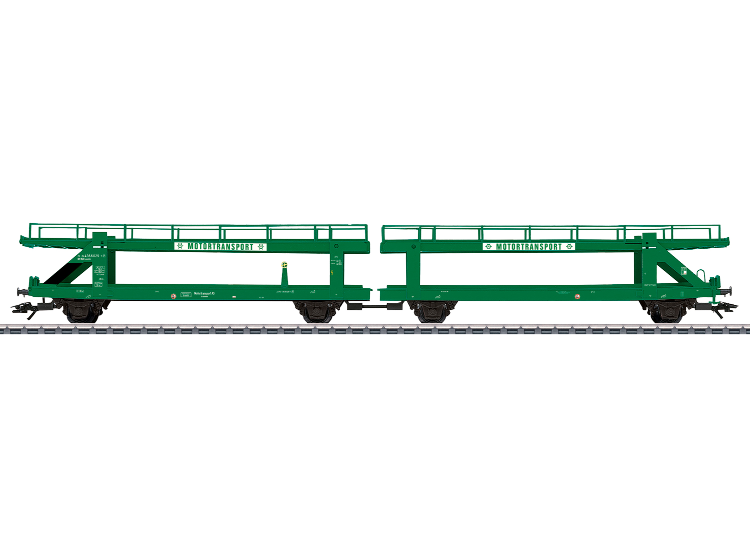 Doppel-Autotransportwagen Laaeks - Vorbild: Doppel-Autotransportwagen Bauart Laaeks. Privatwagen der Motortransport AS, Drammen, eingestellt bei den Norwegischen Staatsbahnen (NSB). Minzgrüne Grundfarbgebung. Betriebszustand der 1990er Jahre.Modell: Beide Oberdecks an den Wagenenden absenkbar. Untere und obere Auffahrten mit je zwei beweglichen Ladeklappen. Haltekeile für Modellautos liegen bei. Kurzgekuppelte Spezialverbindung mit Norm-Kupplungsaufnahme zwischen den Wagenhälften. Länge über Puffer 31 cm.Gleichstromradsatz E700580.