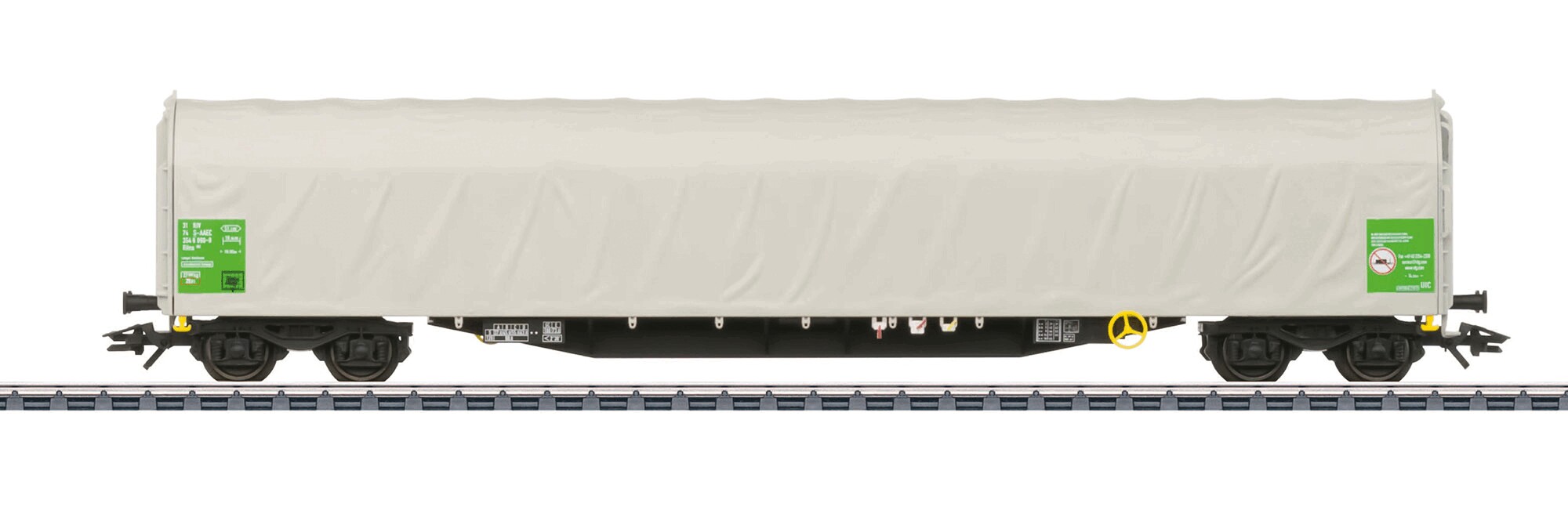 Modell: Spezifische Ausführung des Unterbodens. Viele angesetzte Details. Mit rechteckigen Puffern und Handrad für Feststellbremse. Drehgestelle Typ Y25. Metalleinlage für gute Laufeigenschaften. Darstellung mit geschlossener Plane. Länge über Puffer 22,9 cm. Gleichstromradsatz E700580.