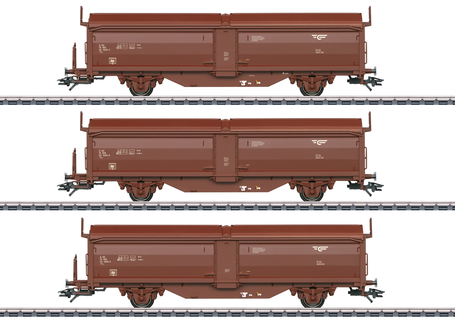 Schiebedach-/Schiebewandwagen-Set Tbis - Modell: Stirnseitig angesetzte hochliegende Bühnen und Aufstiegsleitern. Zusätzlich auf einer Stirnseite angesetzte Bremserbühne. 2-teiliges Wagen-Dach aus Metall jeweils zum Öffnen. Alle Wagen mit unterschiedlichen Betriebsnummern und einzeln verpackt. Zusätzliche Umverpackung. Gesamtlänge über Puffer 50 cm. Gleichstromradsatz je Wagen E700580. Vorbild: 3 zweiachsige Schiebedach-/Schiebewandwagen der Bauart Tbis der Norwegischen Staatsbahnen (NSB). Alle Wagen in kastanienbrauner Grundfarbgebung. Jeweils mit stirnseitiger Bremserbühne. Schiebetüren in gewölbter Ausführung. Betriebszustand um 1988. Neukonstruktion des Schiebedach-/Schiebewandwagen-Typs Bauart Tbis.Schiebetüren in gewölbter Ausführung.2-teiliges Schiebedach aus Metall jeweils zum Öffnen.Alle Wagen mit unterschiedlichen Betriebsnummern und einzeln verpackt. Neukonstruktion mit Schiebetüren in gewölbter Ausführung