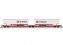 Doppel-Taschenwagen Sdggmrss 738 - Vorbild: 6-achsiger Doppel-Taschenwagen mit Gelenk der Bauart Sdggmrss 738 (T3000e) der Deutschen Bahn AG (DB AG). Moderner Tragwagen für den kombinierten Ladungsverkehr. Verkehrsrote Grundfarbgebung. Ausführung mit zwei seitlichen Klappriegeln. Betriebszustand ab 2013. Beladen mit zwei Gardinenplanen-Sattelaufliegern der Spedition DB Schenker.Modell: Beide Tragwagenhälften aus Metall, beweglich gelagert auf dem mittleren Drehgestell. Seitliche Klappriegel ab Werk montiert. Hochklappbar für den Transport von Containern oder Wechselbrücken. Viele separat angesetzte Details wie Übergangsrost, Tritte, Bremsleitungen und Haltestangen an den Wagenenden. Drehgestelle Bauart Y25. Pufferhöhe nach NEM. Aufnahme für Stützbock, Halterungen für Königszapfen in hoher und niedriger Ausführung, Rangiertritte und Luftkessel für die Wagenenden liegen als separat ansteckbare Teile bei. Beladen mit zwei Gardinenplanen-Sattelaufliegern der Spedition DB Schenker. Länge über Puffer ca. 39,3 cm. Gleichstromradsatz E700580.Einen weiteren Doppel-Taschenwagen mit anderer Betriebsnummer und Beladung finden Sie im Trix H0-Sortiment unter der Artikelnummer 24470 mit dem Hinweis auf die benötigten Tauschradsätze.Weitere Doppel-Taschenwagen mit vorbildgerechten konstruktiven Unterschieden finden Sie im Märklin H0-Sortiment unter der Artikelnummer 47471 und 47472 sowie im Trix H0-Sortiment unter der Artikelnummer 24471 und 24472.Passende moderne Elektrolokomotiven der Baureihe 186, 189 oder 193 finden Sie im Märklin H0-Sortiment.