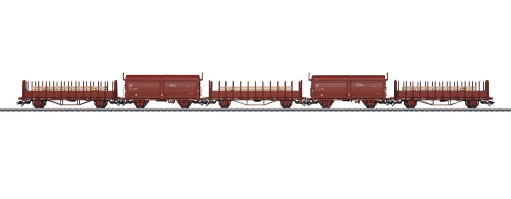 Modell: Rungenwagen mit Holzbeladung. Alle Wagen mit unterschiedlichen Betriebsnummern. Gesamtlänge über Puffer ca. 66,5 cm. Gleichstromradsatz je Wagen 2 x 700580.
