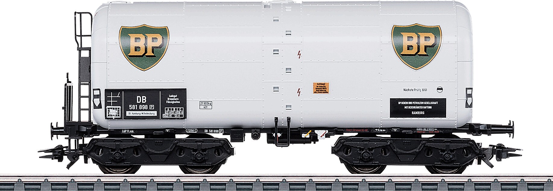 Vorbild: Vierachsiger Schweröl-Kesselwagen mit Bremserbühne. Privatwagen der BP Benzin- und Petroleum GmbH, Hamburg, eingestellt bei der Deutschen Bundesbahn (DB). Betriebszustand um 1957.