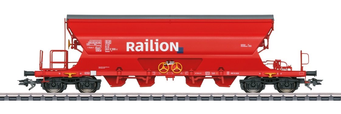 SelbstentladewagenTanoos 896 - Vorbild:Vierachsiger Selbstentladewagen mit Schwenkdach als Kaliwagen der Bauart Tanoos 896. Verkehrsrote Grundfarbgebung. Deutsche Bahn AG (DB AG). Betriebszustand der Epoche V.Modell: Detaillierte Ausführung mit vielen angesetzten Einzelheiten, wie Entladevorrichtungen, Handräder und Geländer. Separat angesetzte Bühnen. Schwenkdächer zum Öffnen. Länge über Puffer 18,2 cm.