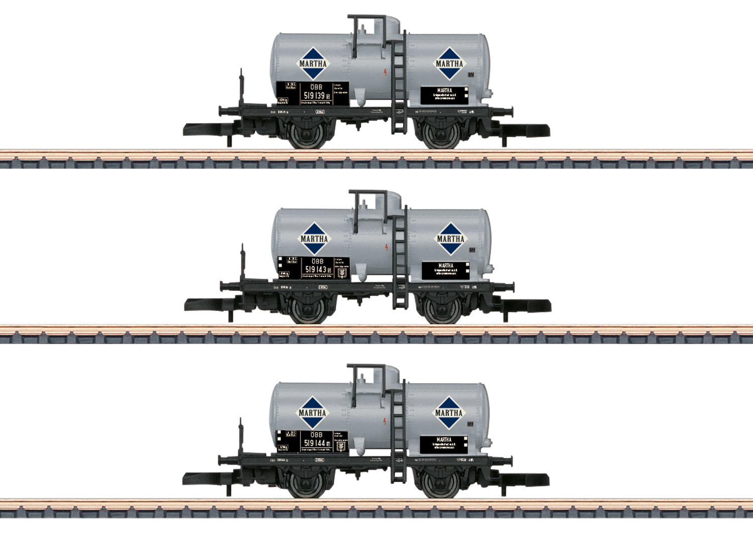 Kesselwagen-Set - Modell: Alle 3 Kesselwagen vorbildgerecht umgesetzt. Schwarze Scheibenräder. Wagenlänge über Puffer 124 mm.Wagen einzeln nicht erhältlich. Vorbild: Drei 2-achsige Kesselwagen mit Bremserbühne,der Erdölgesellschaft Martha, eingestellt bei der ÖBB im Zustand der Epoche III.