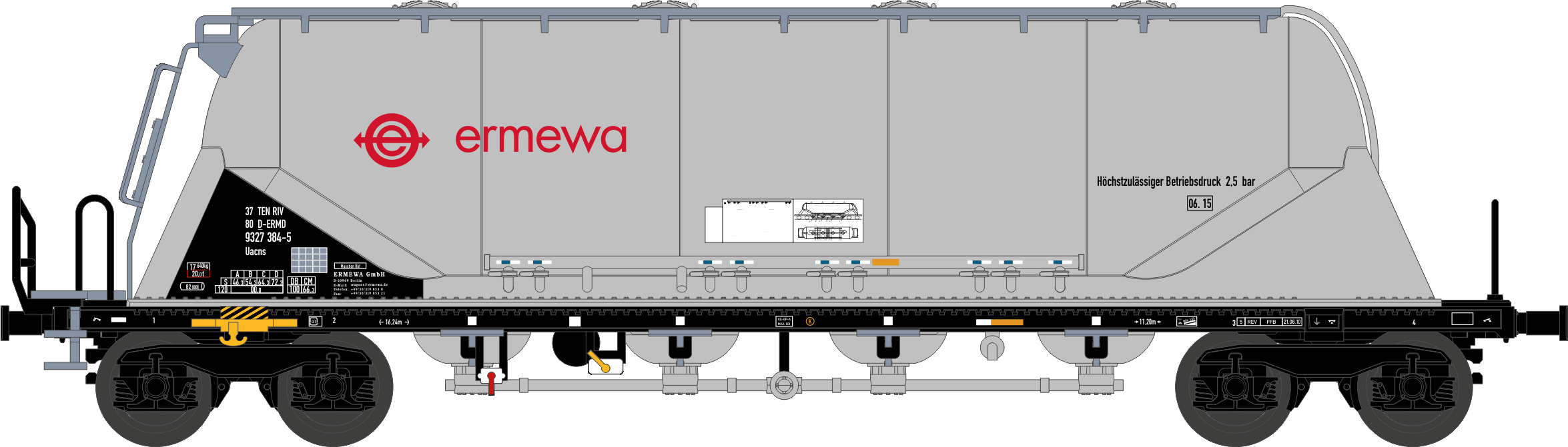 Staubsilowagen der Bauart Uacns (82m³) der Ermewa für die Epoche 6. Modell: Viele angesetzte Metall- und Kunststoffteile geben das Erscheinungsbild des Vorbilds im Maßstab 1:160 sehr gut wieder. Das NME-Modell verfügt über Kurzkupplungskulisse, NEM-Schacht und perfekte Laufeigenschaften.
