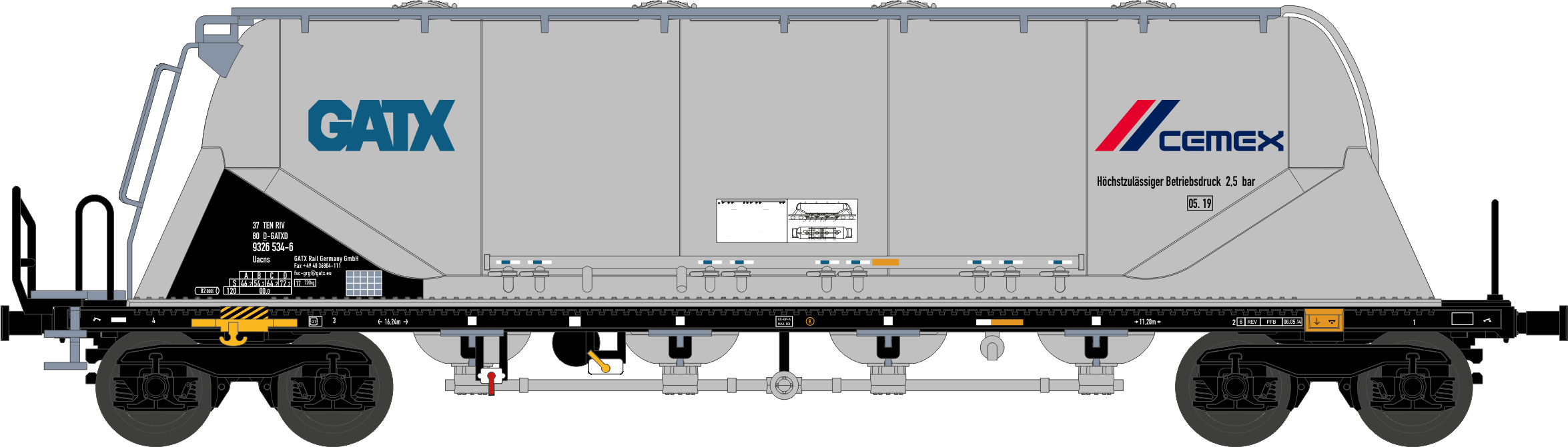 Staubsilowagen der Bauart Uacns (82m³) der Gatx -Cemex für die Epoche 6. Modell: Viele angesetzte Metall- und Kunststoffteile geben das Erscheinungsbild des Vorbilds im Maßstab 1:160 sehr gut wieder. Das NME-Modell verfügt über Kurzkupplungskulisse, NEM-Schacht und perfekte Laufeigenschaften.