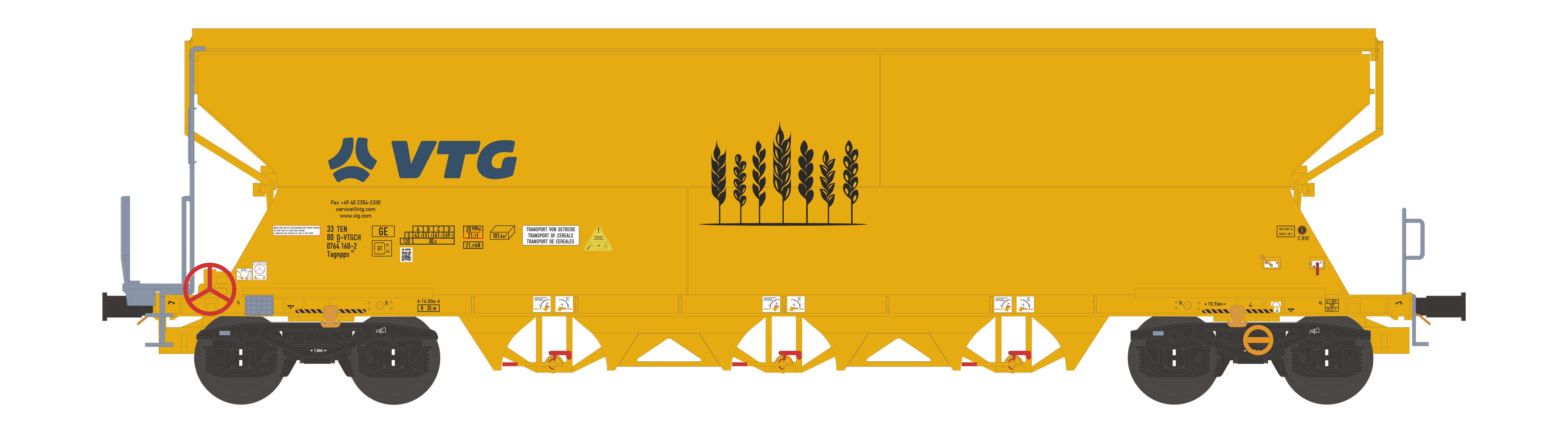 Getreidewagen Tagnpps 101m³, gelb blaues VTG Logo, für die Epoche 6 Betriebsnummer: 33380 0764 160-2