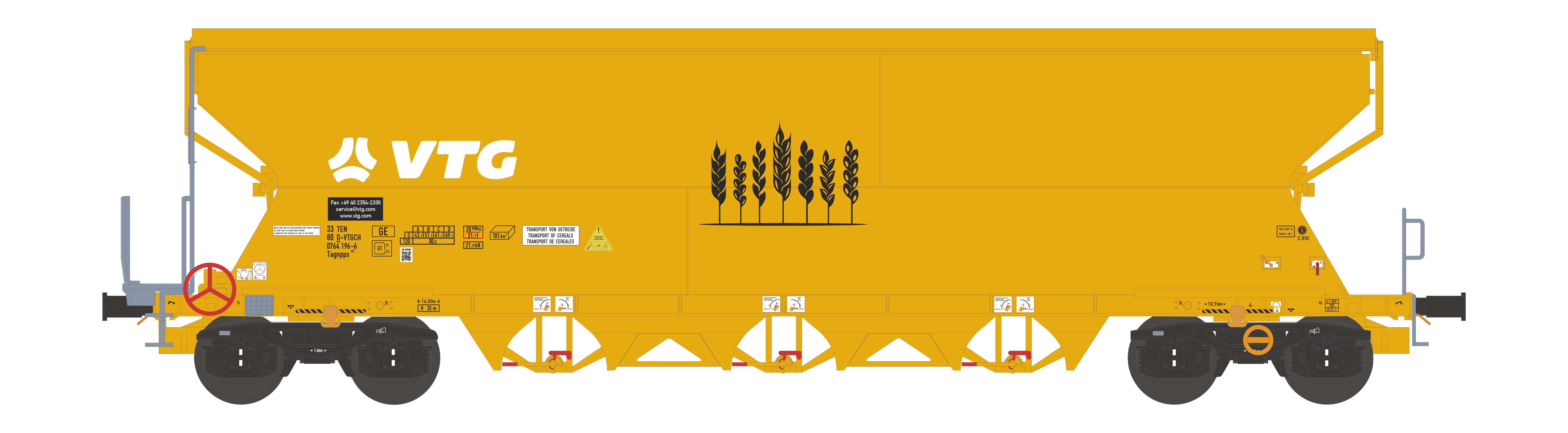 Getreidewagen Tagnpps 101m³, gelb weisses VTG Logo, für die Epoche 6 Betriebsnummer: 3380 0764 199-0