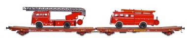 Flachwageneinheit Laads TWA 1060, beladen mit 2 Feuerwehrfahrzeugen und Radvorlegern, für die Epoche 6.