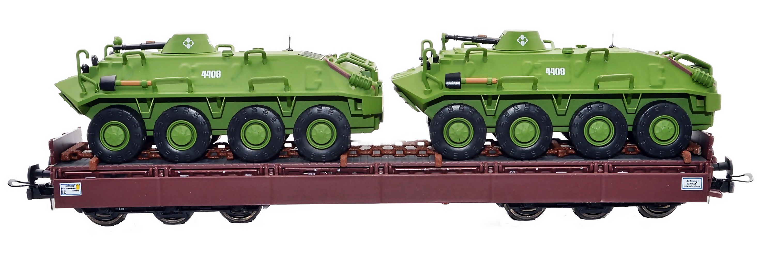 H0 - Schwerlastwagen Bauart Sas 4850 für den Militärverkehr der DR, Epoche IV, mit abgeklappten Seitenbordwänden beladen mit Schützenpanzer BTR 60 PB der Polnischen Armee