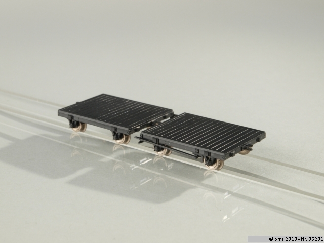 Set bestehend aus zwei Flachwagen für Rottenwagen. Modelldetails: Kunststoffspritzgussteil. Für alle Bahngesellschaften geeignet. Vorbild: Kleine Plattenwagen verrichten in der Bahnmeisterei, im Betriebswerk oder in der Lokeinsatzstelle ihren Dienst beim Transport von schweren Ersatzteilen, Material oder Werkzeug.