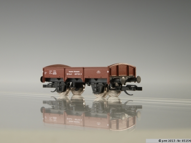 Niederbordwagen der DRG für die Epoche 2. Modelldetails: Länge über Puffer: 55,0 mm. Mit Kurzkupplung. Verbandsbauart nach Musterzeichnung. Kunststoff-Fertigmodelle aus Großserien-Spritzgussform. Bei jeder neuen Fertigungsserie erhalten die Waggonmodelle andere Wagennummern.
