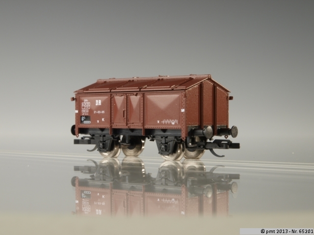 Klappdeckewagen 2-achs der DR für die Epoche 3. Modelldetails: Länge über Puffer: 55,0 mm. Mit Kurzkupplung. Verbandsbauart nach Musterzeichnung. Kunststoff-Fertigmodelle aus Großserien-Spritzgussform. Bei jeder neuen Fertigungsserie erhalten die Waggonmodelle andere Wagennummern.