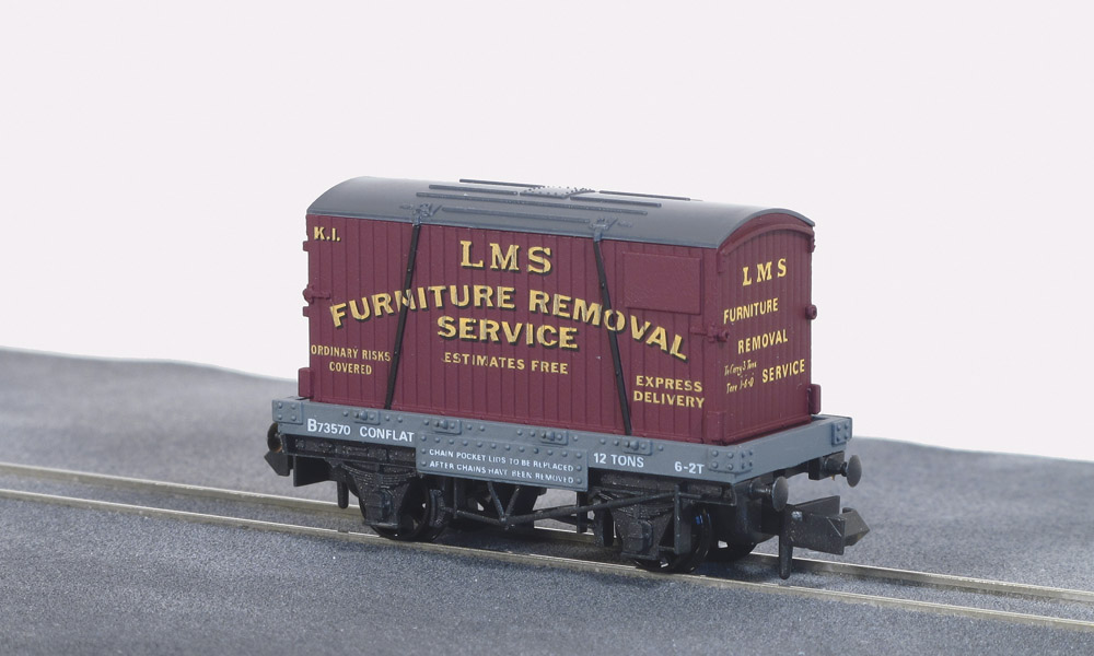 Einst als "Koffer der Industrie" bezeichnet, waren diese Eisenbahncontainer der Vorläufer des modernen Containers. Sie ermöglichten es, eine enthaltene Ladung schnell zu entladen oder vom Schienen- auf den Straßentransport umzuladen. Alle Peco-Waggons haben freilaufende Räder in Steckachsen. Die ELC-Kupplung ist zwar mit den Standard-Kupplungen der Spur N kompatibel, sorgt aber für einen realistischen Abstand zwischen den Fahrzeugen und ermöglicht die Verwendung des elektromagnetischen Entkupplers PL-25 für die Fernentkupplung.