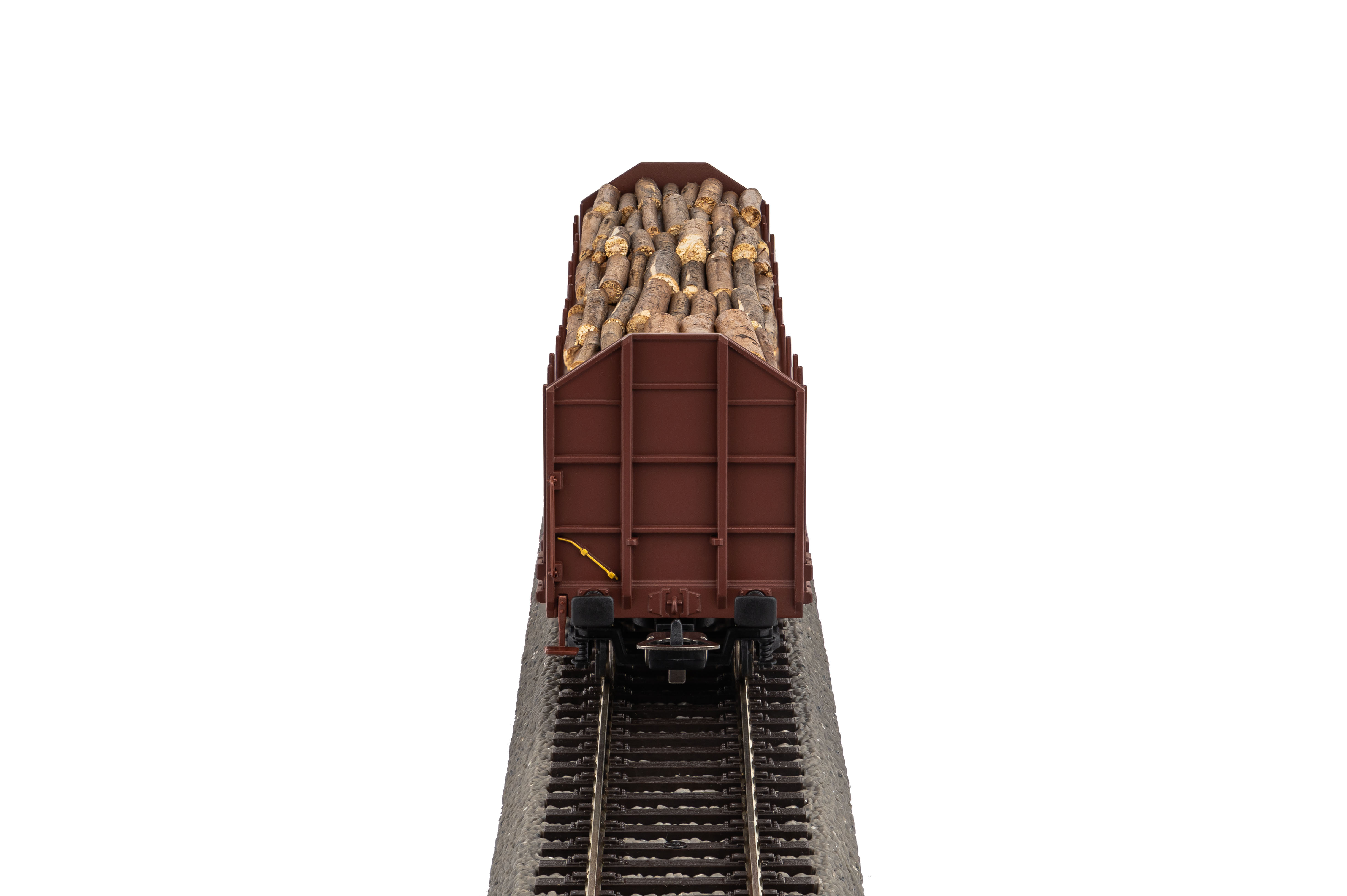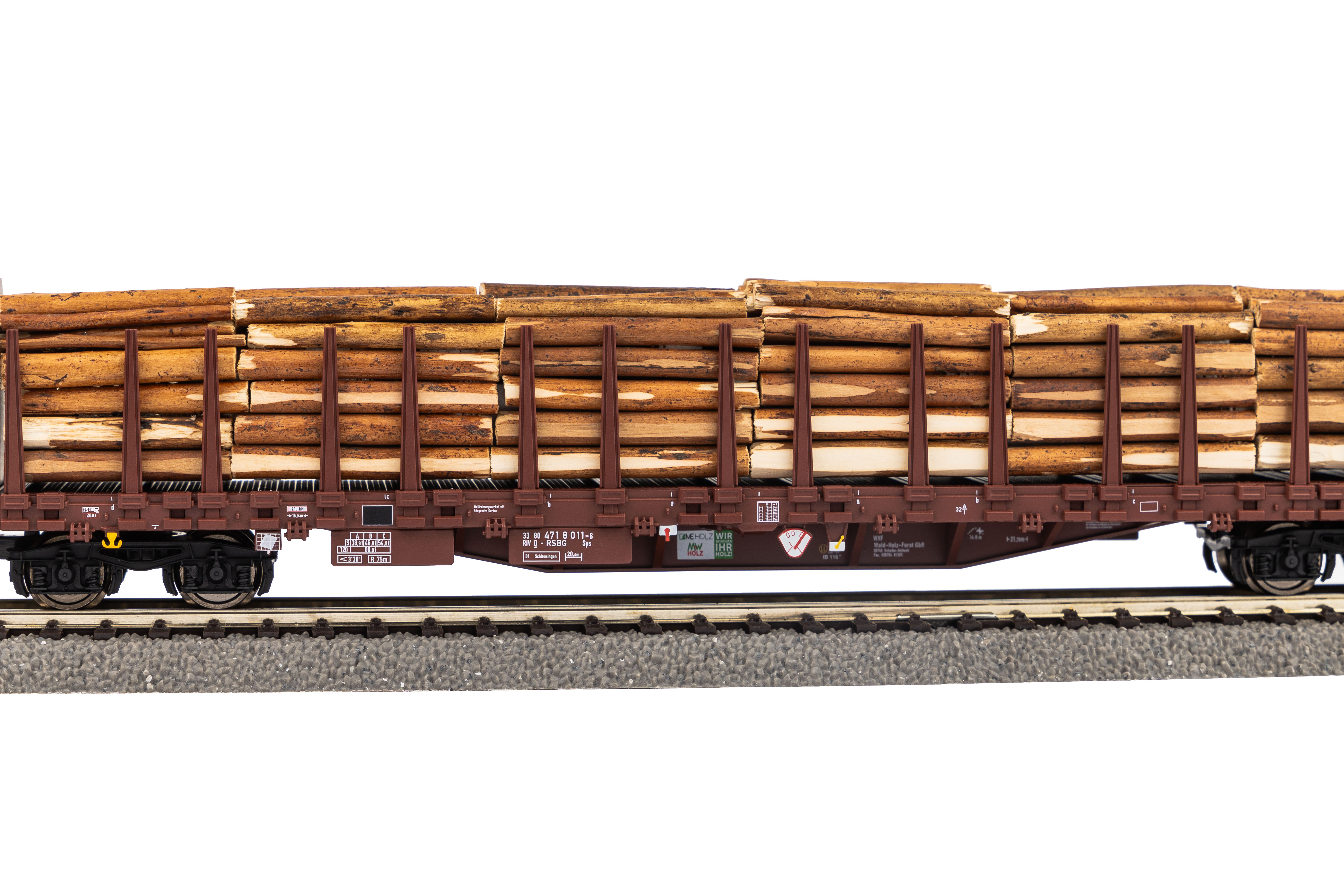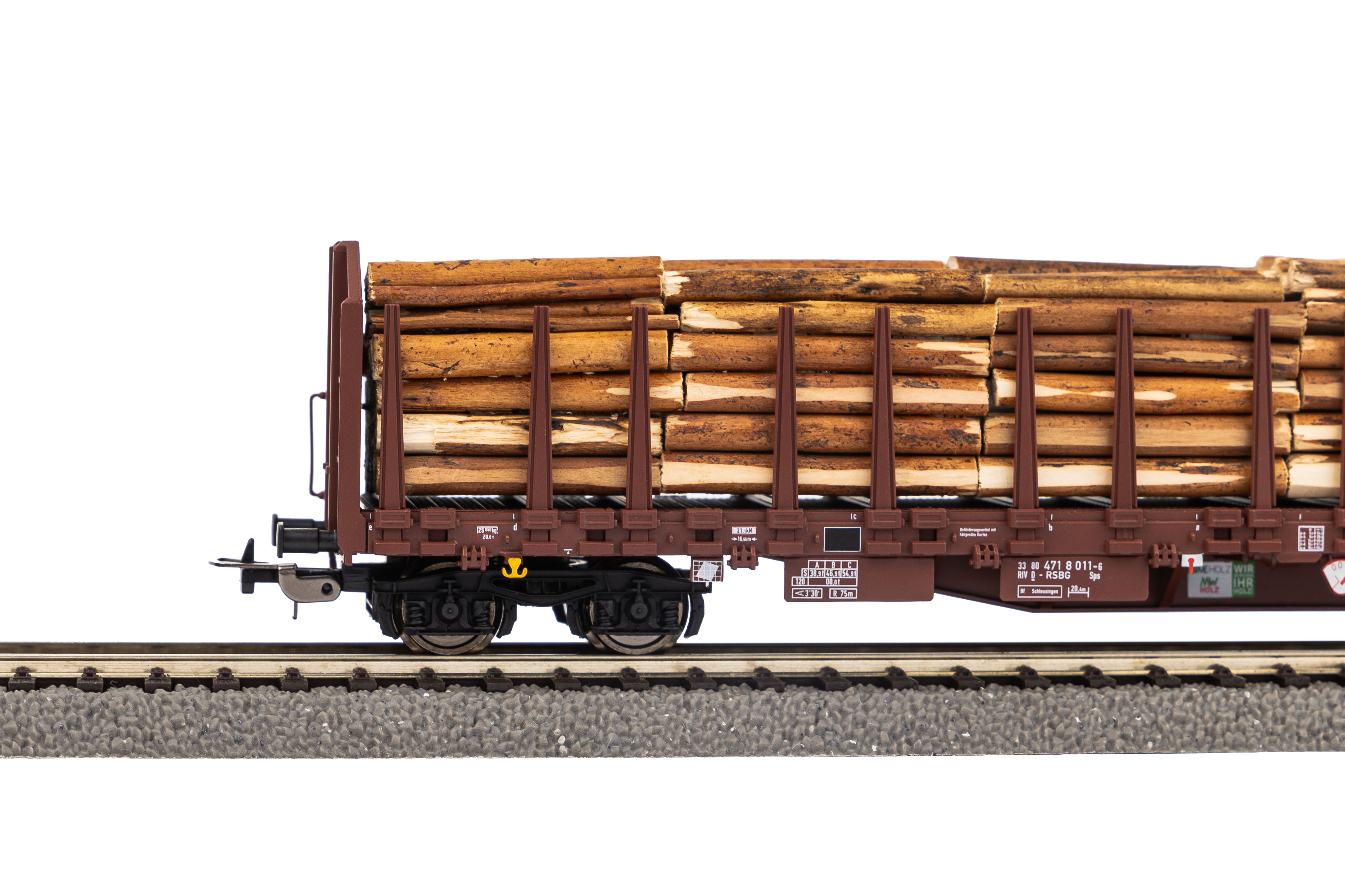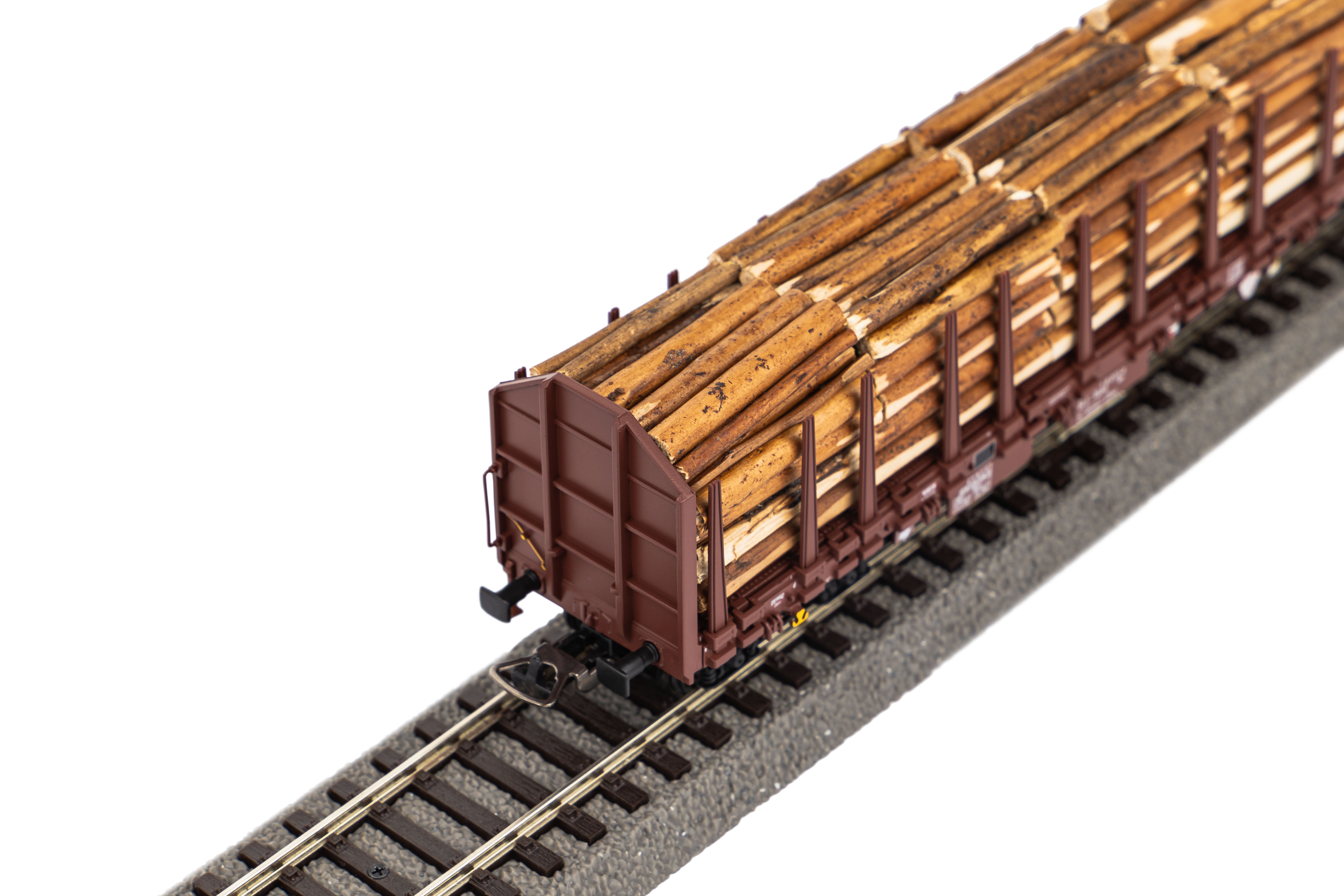 Neuheit 2024: Stammholztransportwagen der RSBG in Epoche VI mit Echtholzbeladung. Das Modell überzeugt durch zahlreiche, liebevoll ausgestaltete Details und hervorragende Rolleigenschaften.