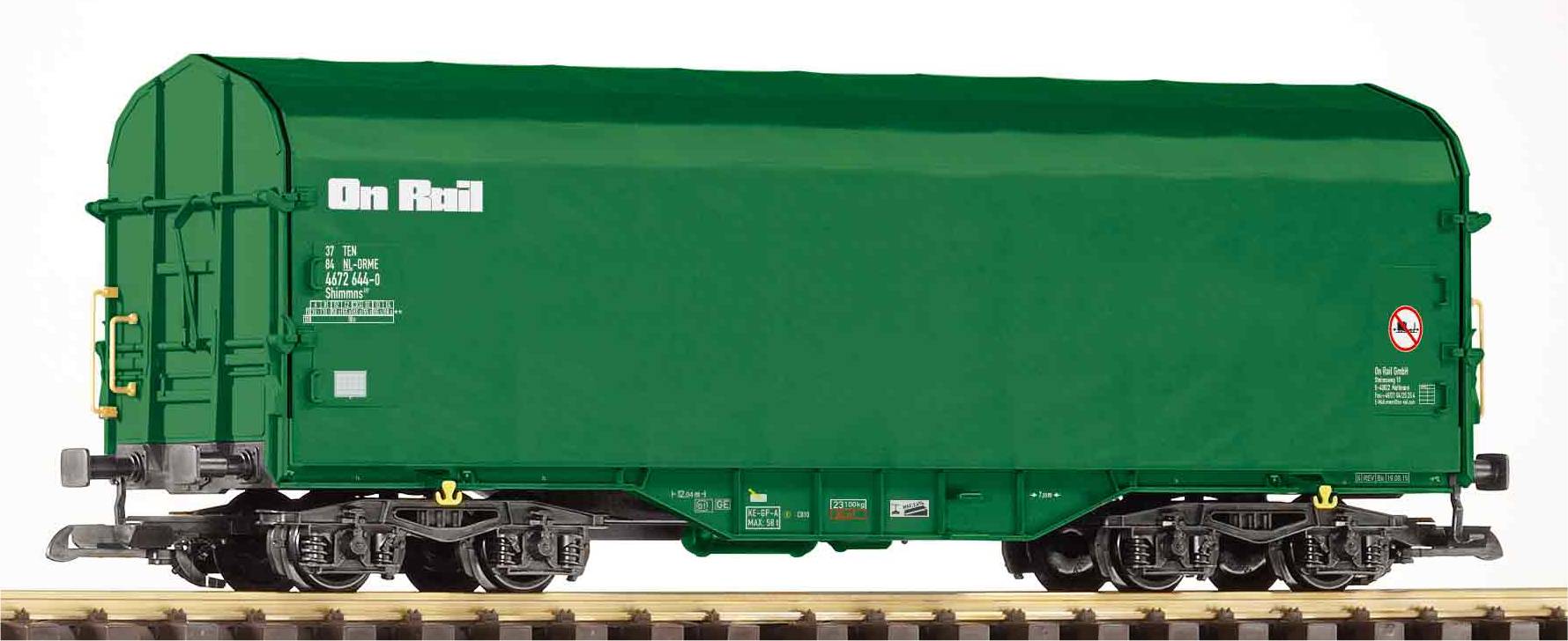 Neuheit 2024: Druckvariante des Schiebeplanenwagens Shimmns im Design von "On Rail" in Epoche VI. Die Plane des Wagens ist realistisch nachgebildet. Neben der vorbildgerechten Optik überzeugt das Modell zudem durch hervorragende Rolleigenschaften.