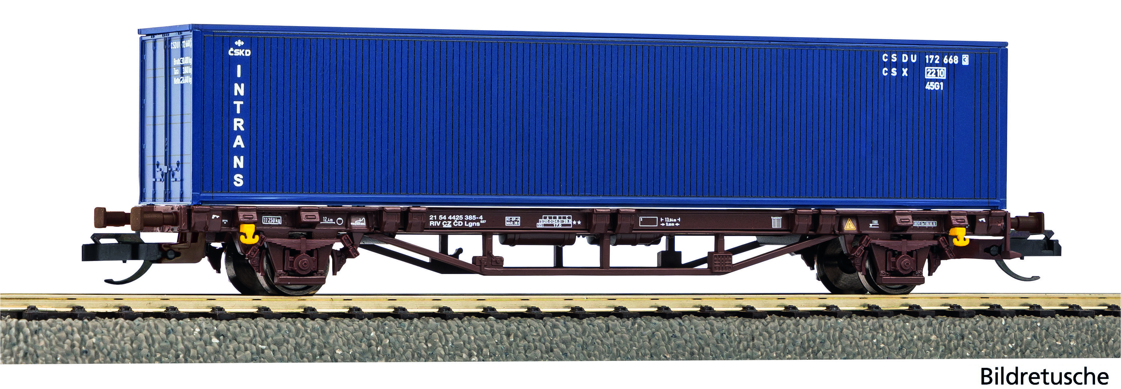 Neuheit 2025: Containertragwagen der CD, beladen mit einem 40'-Intrans-Container in Epoche V.Das Modell verfügt über TT Kurzkupplungen!