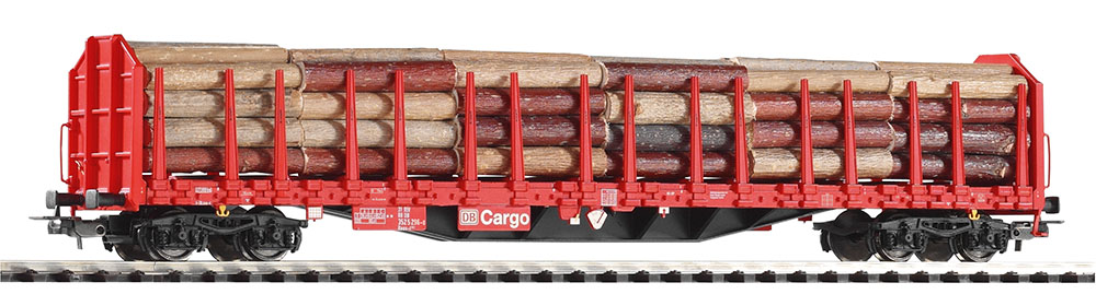 Stammholztransportwagen Roos-t642 der DB AG. Druckvariante der DB Cargo mit Echtholzladung und klappbaren Rungen.