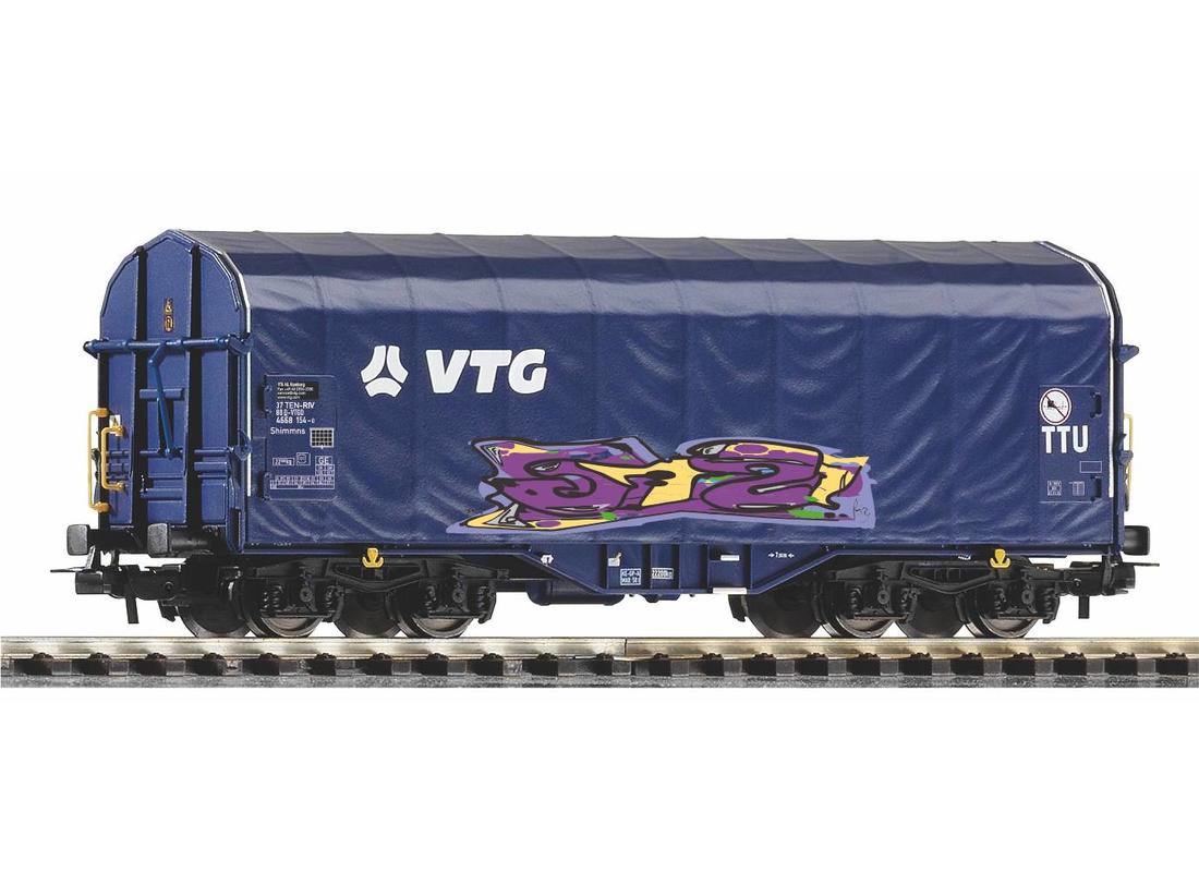 Druckvariante des Schiebeplanenwagens im attraktiven Dekor von VTG in der Epoche VI. Der Wagen trägt beidseitig unterschiedliche Graffitis.