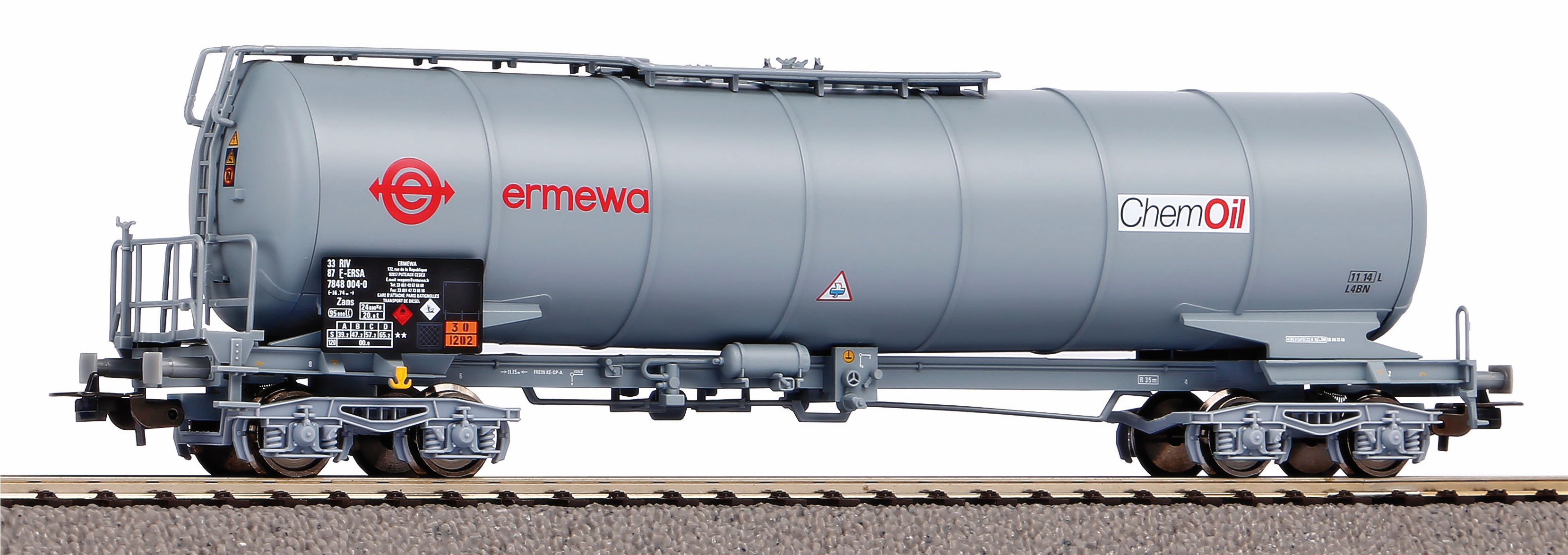 Druckvariante des Knickkesselwagens "ERMEWA" in der Ausführung der Epoche VI. Anfang der neunziger Jahre wurden die ersten Tankwagen mit einem sogenannten "Knickkessel" gebaut. Die Konstruktion der Kessel erfolgte so, dass sich die beiden Kesselhälften zur Mitte hin um jeweils 3° neigen. Deshalb fließt der Kesselinhalt, in der Hauptsache Mineralölprodukte, ohne weitere Hilfsmittel so gut wie restlos ab. Da die in Stahlleichtbauweise gefertigten Fahrzeuge für höhere Geschwindigkeiten geeignet sind, wurden sie bald auch von anderen Unternehmen in ganz Europa beschafft. Zu finden sind diese Waggons als P (=Privat)-Wagen im Bestand aller europäischer Bahngesellschaften.