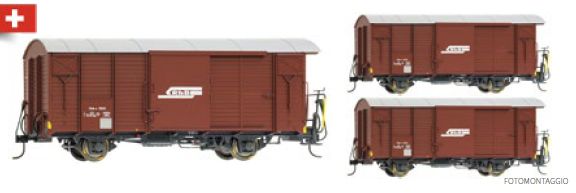 3-teiliges Güterwagen-Set Bauart Gbk der RhB in rotbrauner Lackierung, für die Epoche 4/5.