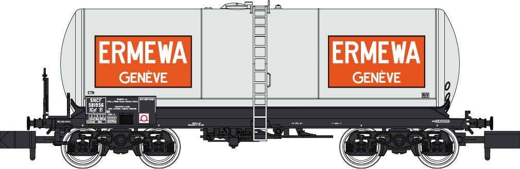 Kesselwagen 4-achsig Typ ANF mit Y 23M Drehgestellen "ERMEWA-GENEVE", eingestellt bei der SNCF, für den Transport von Wein, Betriebsnummer 581956, für die Epoche 3.
