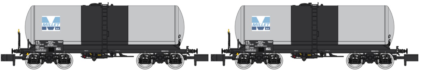 Kesselwagen-Set 2-teilig Typ ANF mit Y 23M Drehgestellen "MILLET", eingestellt bei der SNCF, für den Transport von Schmierstoffen, Betriebsnummern 84 87 755 0 125-9 und 84 87 755 0 132-5, für die Epoche 5.