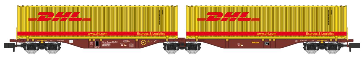 Doppelcontainerwagen Bauart Sggmrss 90 der TOUAX mit 2 x 45' DHL Container für die Epoche 6