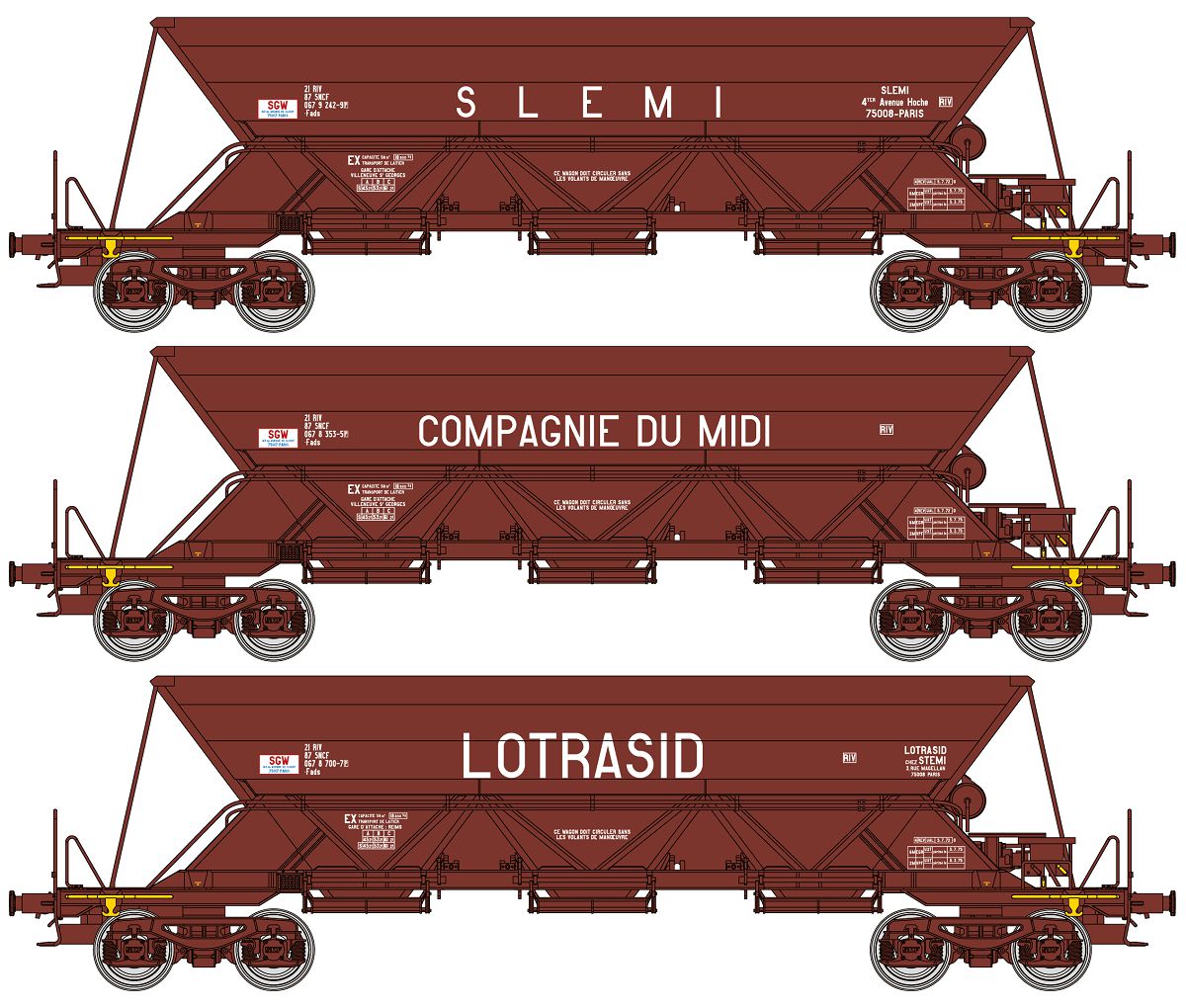 3-teiliges Selbstentladewagen-Set "SLEMI, COMPAGNIE DU MIDI and LOTRASID" der SNCF für die Epoche 4