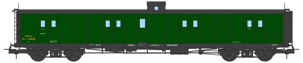 Ex-PLM Gepäckwagen,mit Dachaussichtskanzel, Aufstiegsleitern, PLM grün mit schwarzem Dach, SNCF Nr. 24636, für die Epoche 3.