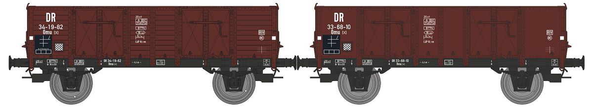 Set mit 2 Offene Güterwagens, aus Holz gemacht N°34-19-82 und Metallaufbau N°33-68-10 Ep.IV DR