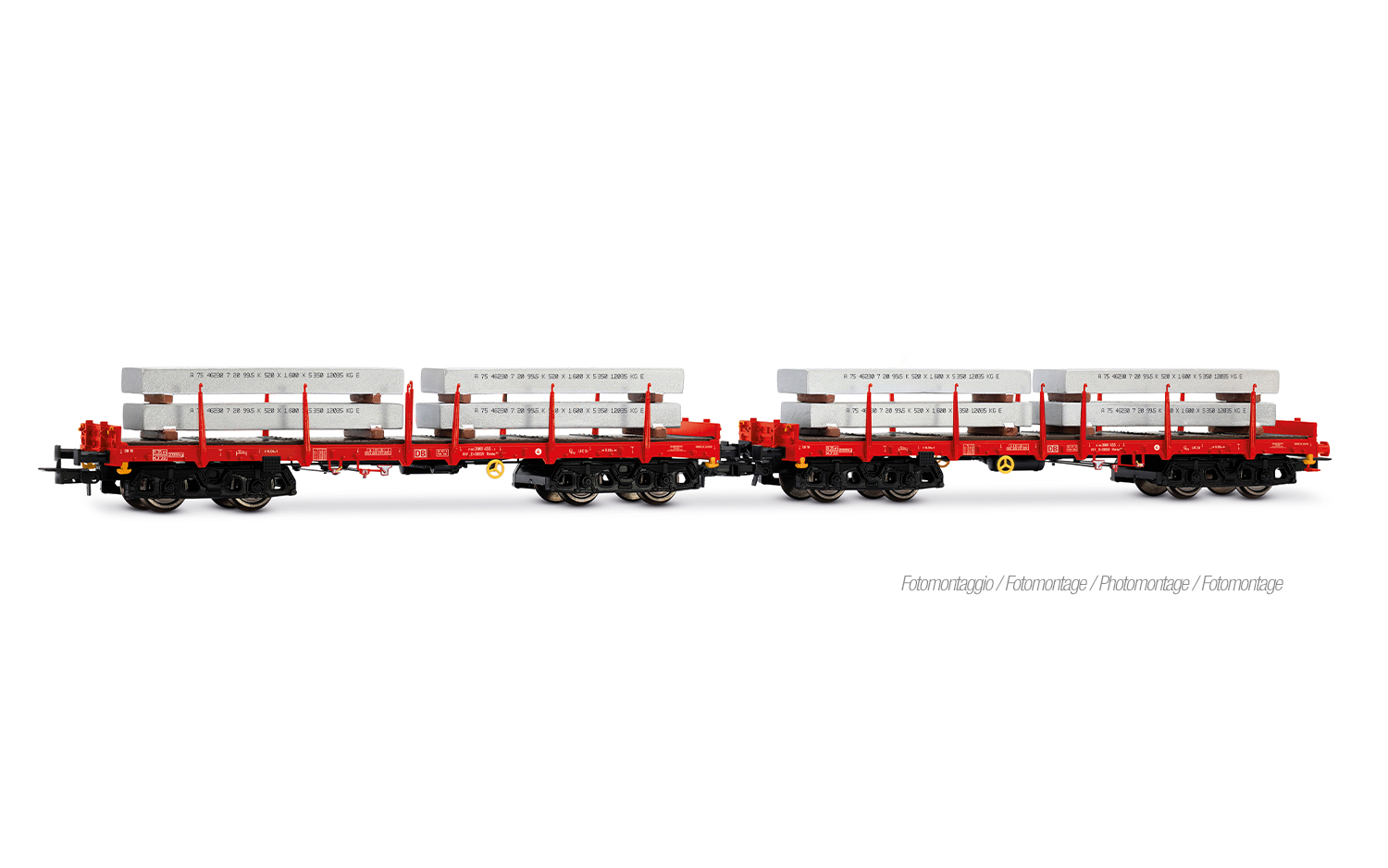 D-DBSR, 2-tlg. Set 4-achs. Rungenwagen der Bauart Rmms, verkehrsrot, beladen mit Aluminiumblöcken -