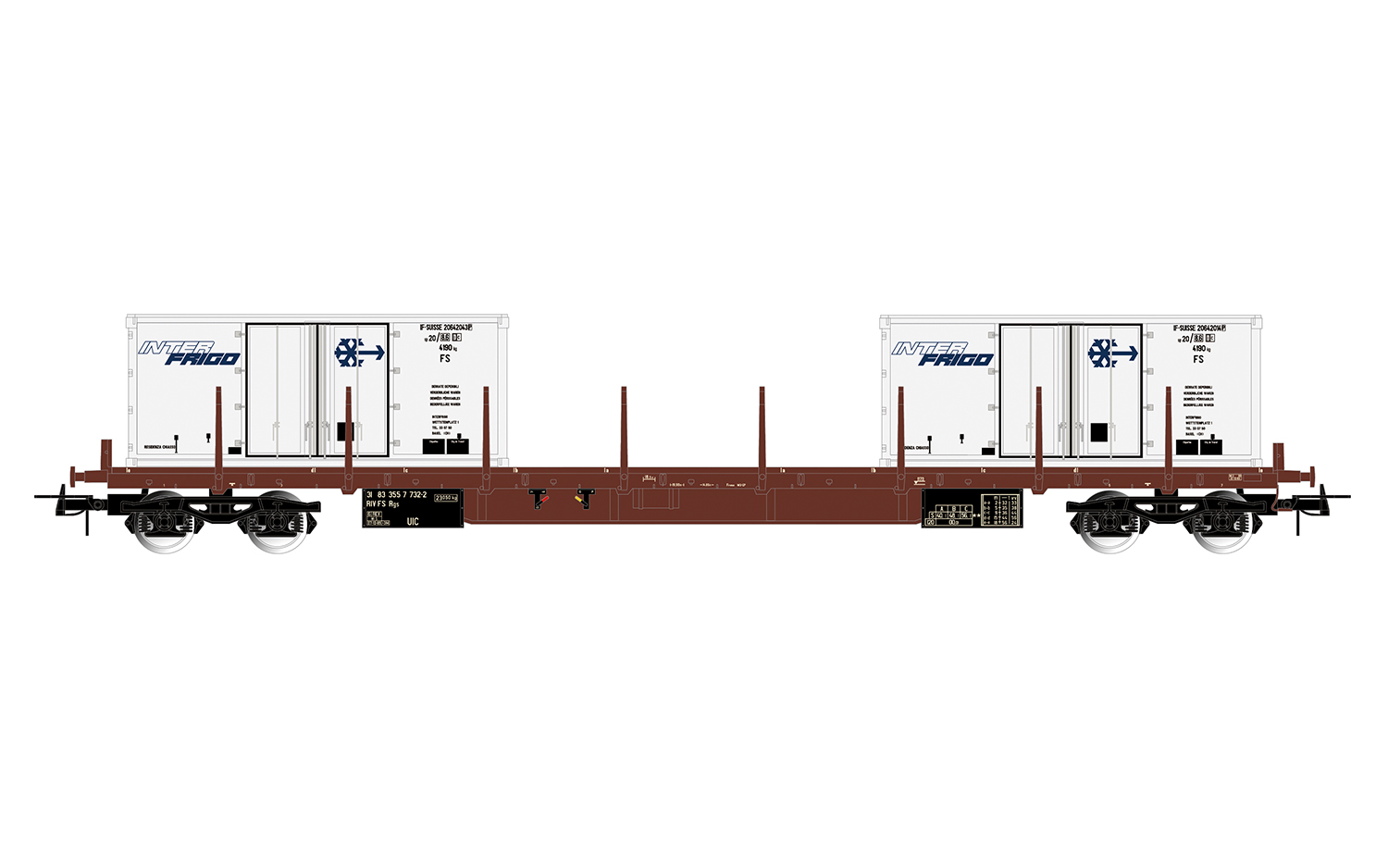 FS, Flachwagen Typ Rgs, braune Farbgebung, mit zwei 20'-Kühlcontainern "Interfrigo"“ -
