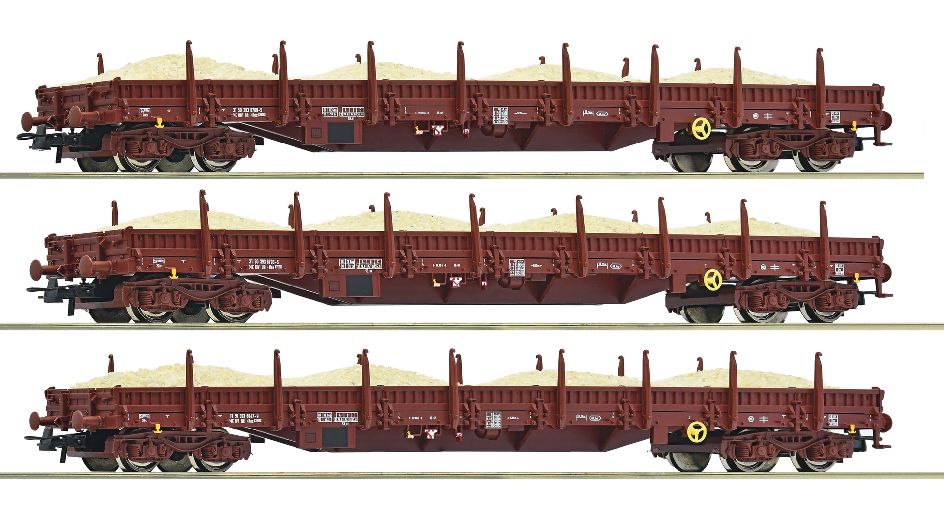 Wagenset 2 mit drei Flachwagen, Gattung Res, der Deutschen Reichsbahn.
