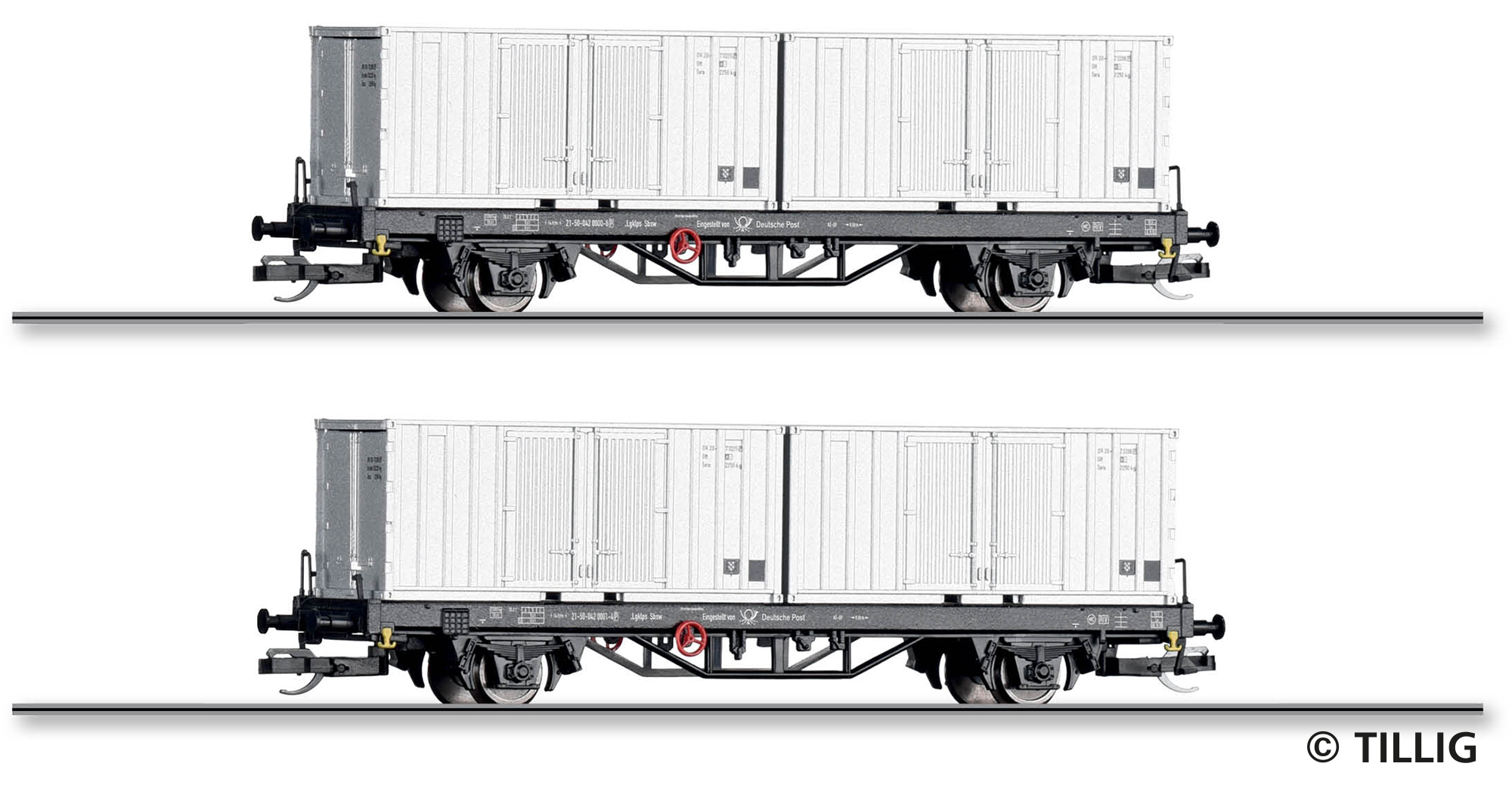 Güterwagenset der Deutschen Post, bestehend aus zwei Containertragwagen Lgklps mit Beladung, Ep. IV