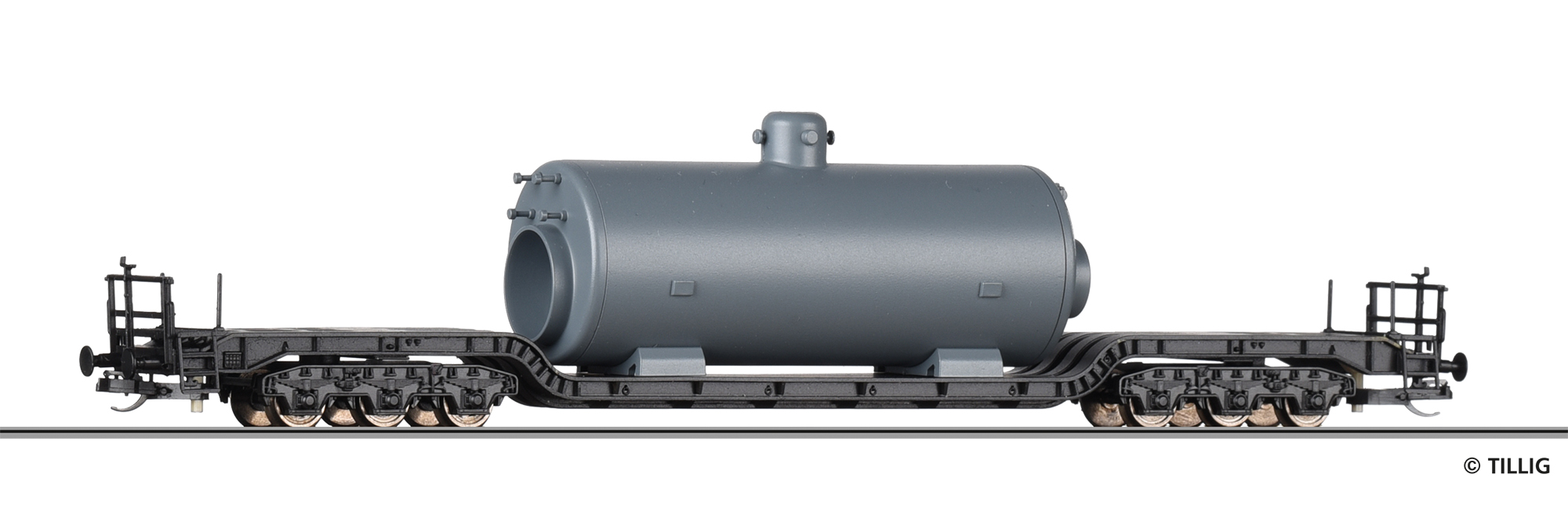 Tiefladewagen SSt 49 der DB, beladen mit Dampfkessel, Ep. III