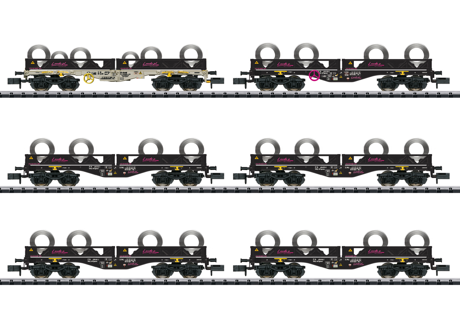 Vorbild: 5 vierachsige Containertragwagen der Bauart Sgmmnss 40' der Laude und 1 vierachsiger Containertragwagen der Bauart Sgmmns 190 der AAE. Beladen mit Coils. Betriebszustand 2017.