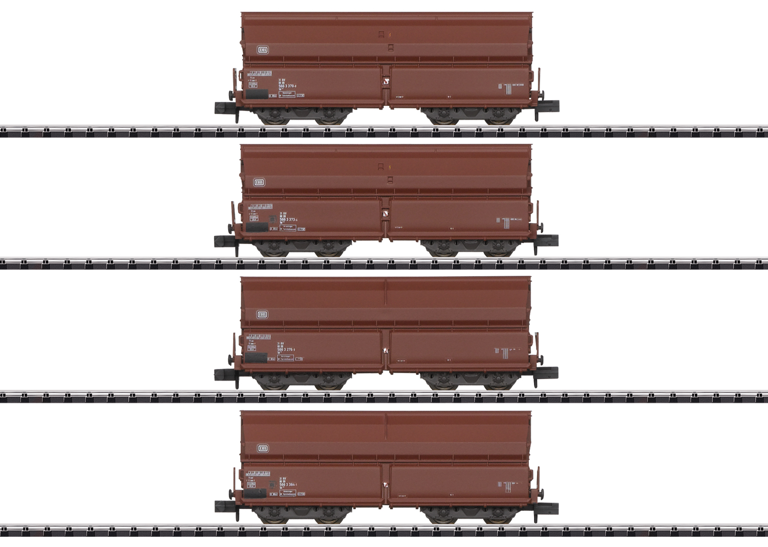 Modell: Neukonstruktion. Selbstentladewagen in detaillierter Ausführung mit unterschiedlichen Betriebsnummern. Alle Wagen mit Bremserbühne und stirnseitigem Stellrad. Alle Wagen mit Kinematik für Kurzkupplung. Ein Wagen mit bedruckten Zugschlussscheiben an einem Wagenende. Gesamtlänge über Puffer 284 mm. Vorbild: 4 vierachsige Selbstentladewagen der Bauart Tal 963 (Kkt-62) der Deutschen Bundesbahn (DB). Ausführung mit zwei Entladeklappen je Längsseite und stirnseitiger Bremserbühne. Wagen mit Drehgestellen der Bauart Minden-Dorstfeld. Eingesetzt zum Transport von nässeempfindlichen und nässeunempfindlichen Gütern. Betriebszustand der 1980er Jahre. Einmalige Serie. Neukonstruktion.