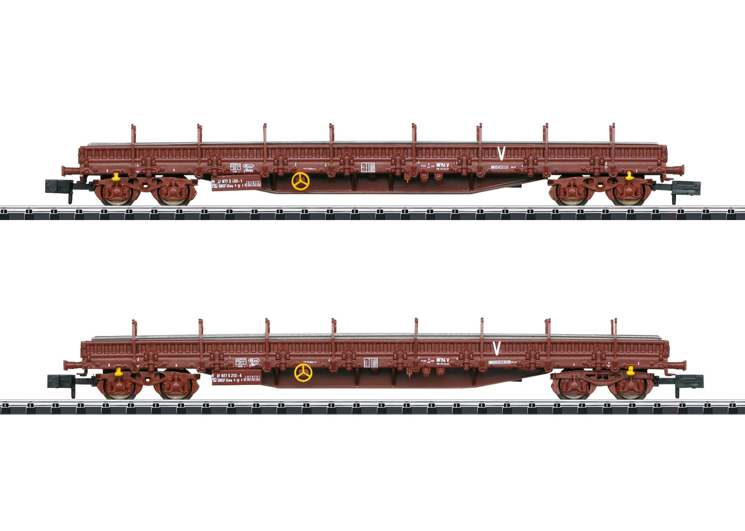 Güterwagen-Set Bauzug - Vorbild: 2 vierachsige Flachwagen mit Rungen der Bauart Uas der SNCF (INFRA). Ein Wagen gemäß Vorbildfoto mit 2 unterschiedlichen Drehgestellbauarten. Beide Wagen sind beladen mit Schienenprofilen. Betriebszustand um 2012.Modell: Wagen 1 mit gegossenen Drehgestellen Typ Y 25, Wagen 2 mit gegossenem und geschweißtem Drehgestell Typ 25. Beide Wagen mit Kinematik für Kurzkupplung und beladen mit Schienenprofilen. Gesamtlänge über Puffer 248 mm.