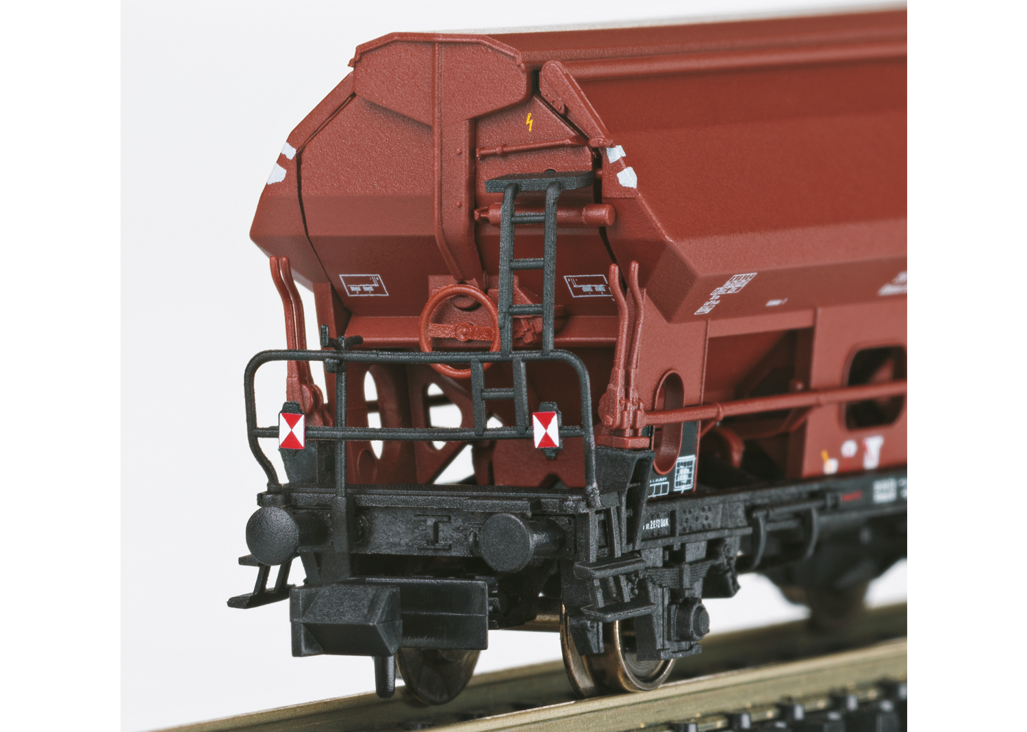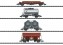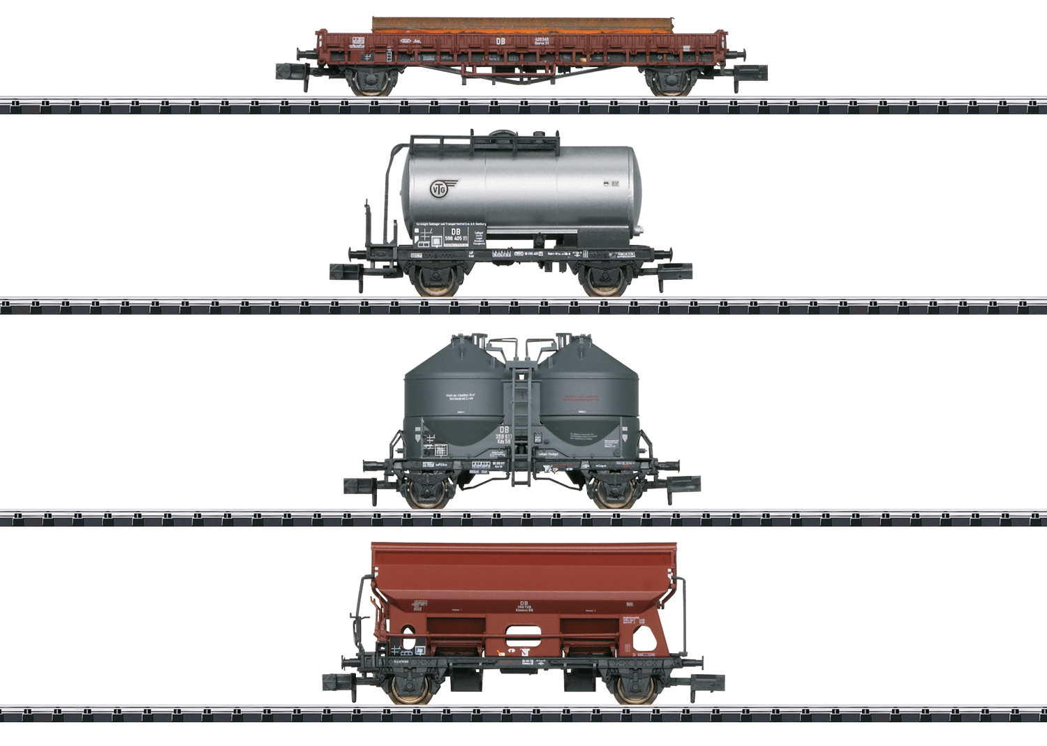 Güterwagen-Set - Vorbild: 1 Niederbordwagen Rmrso 31, 1 2-achsiger Kesselwagen, 1 Silowagen Kds 56 und 1 Seitenentladewagen Ktmmvs 69. Alle Wagen eingestellt bei der Deutschen Bundesbahn. Modell: Mit Kinematik für Kurzkupplung. Niederbordwagen mit Ladegut Stahlstangen, Seitenentladewagen mit Zugschlussscheiben.Gesamtlänge über Puffer 248 mm. Einmalige Serie.